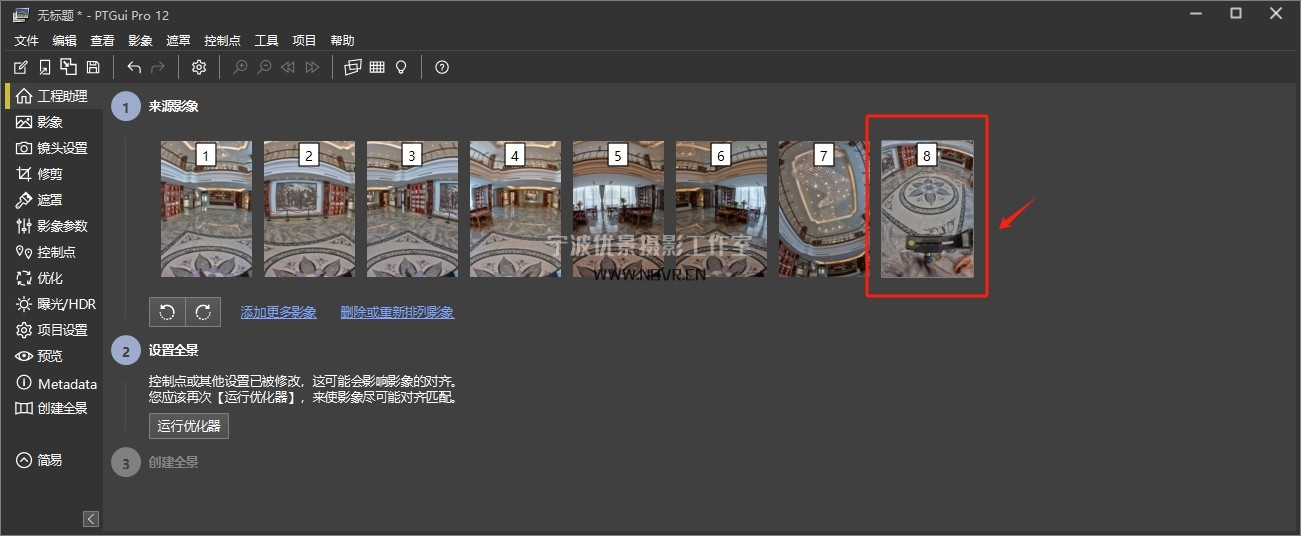 如上图:本次使用6+1+1模式拍摄,360度分6等份拍摄6张,顶部1张和地面1张。