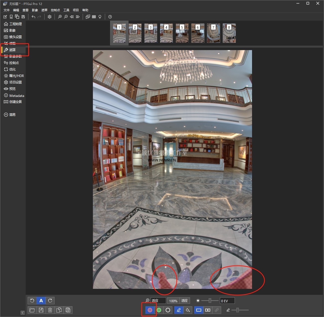 如上图:第8张除脚架位置,其余部分用红色涂抹(让红色部分在全景图中不显示)